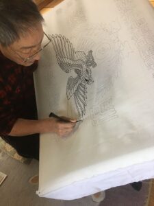 優勝旗作成中~ ~染めの行程 ①糸目~