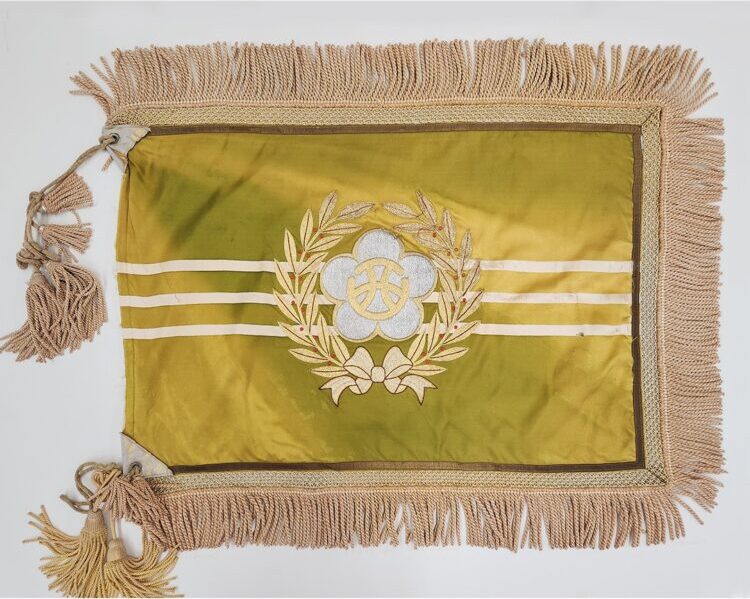 画像を拝見したところかなり地色が退色しており、ところどころ破れやほつれもあり、長い期間活躍した校旗だと感じました。